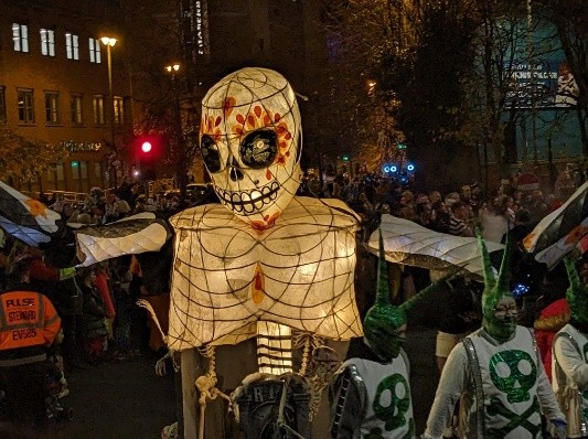 As dusk crept over the city, thousands of people from over the world gathered at the infamous and largest Halloween festival in Europe. The persistent, haunting thuds of the parade echo throughout the streets leaving a lingering eeriness to the crowd. Excitement stole around the crowd as they waited with bated breath for the ghoulish parade to appear around the echoing street corner. “BOOM, BOOM” The drums alert the crowd of the dancing skeletons and magnificent lights hung around ominous statues that must have been 20 foot tall and 8 foot wide. The dark toned oranges, purples, greens and more blend together to create a sinister, powerful vision.